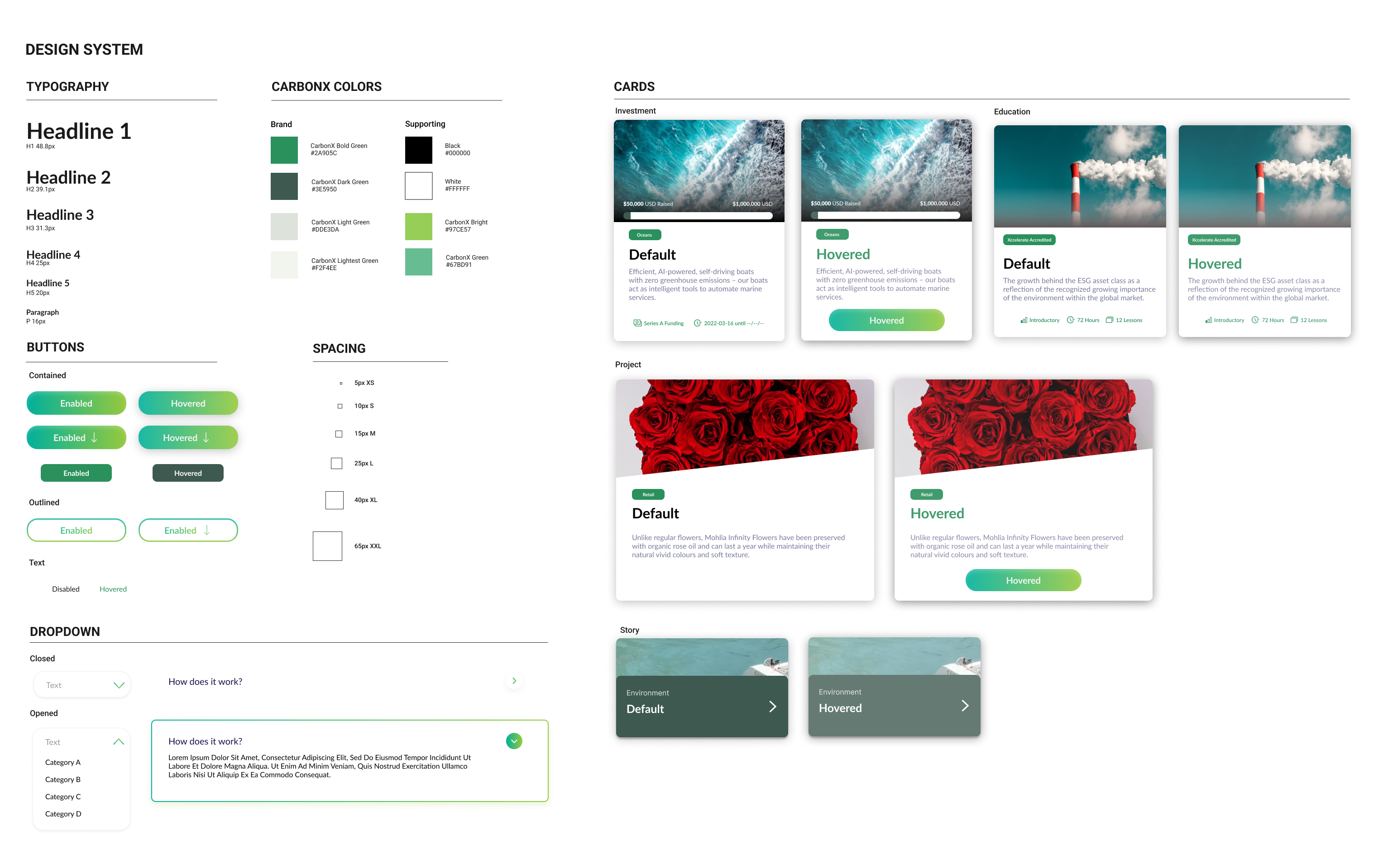 In the beginning of the project, we agreed that CarbonX is going to implement our design on the Webflow platform. Therefore, throughout the project we kept track of our client's learning progression. By the end of the project, we prepared additional suggestions on translating Figma designs into the Webflow - documenting Figma file functionality, as well as listing Webflow resources.