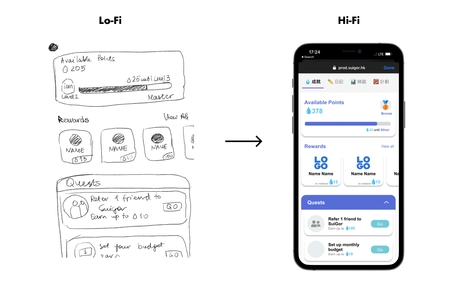 Therefore, after I got more familiar with the team's ways of working, as well as technical limitations, I came up with the screens that balance out user, business and technical needs. Below is the latest high-fidelity design for SuiGor points feature that has been approved to go to production after translating UX copy to Cantonese.