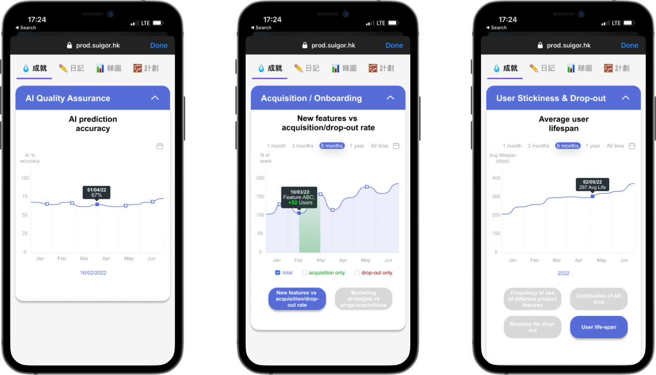 Afterwards, my teammate and I split the construction of high fidelity wireframes. I was responsible for the analytics that require data visualisation in a graph. Below are example screens.